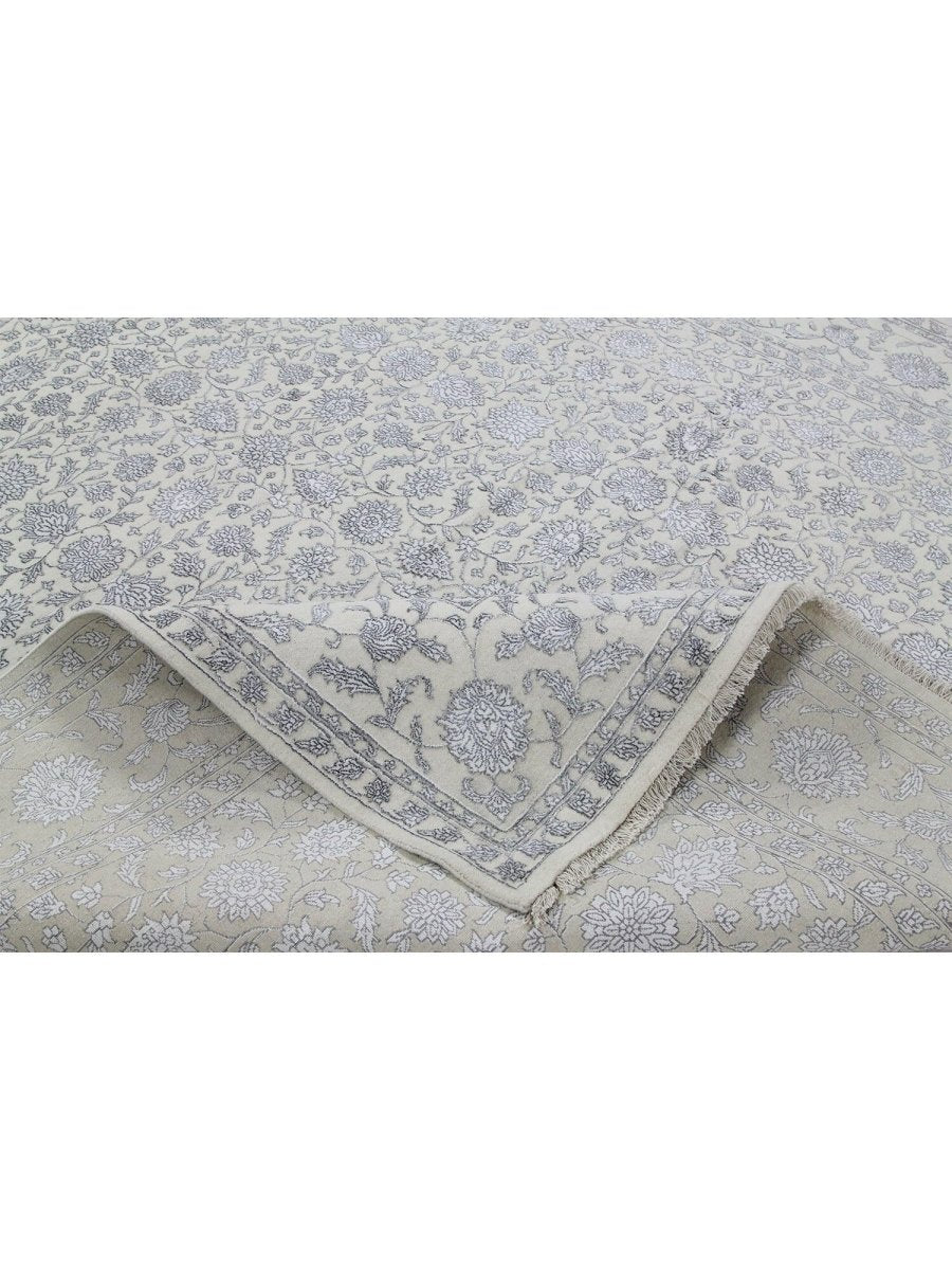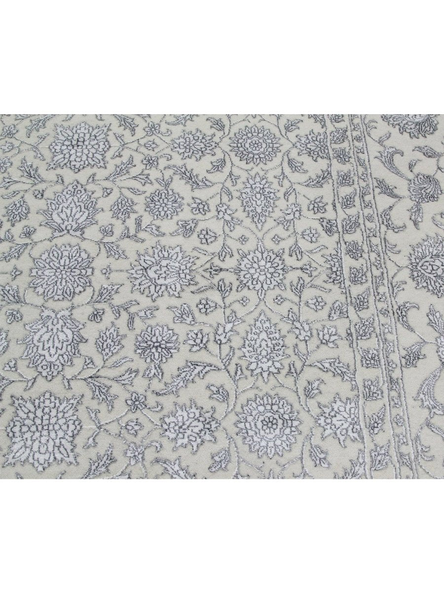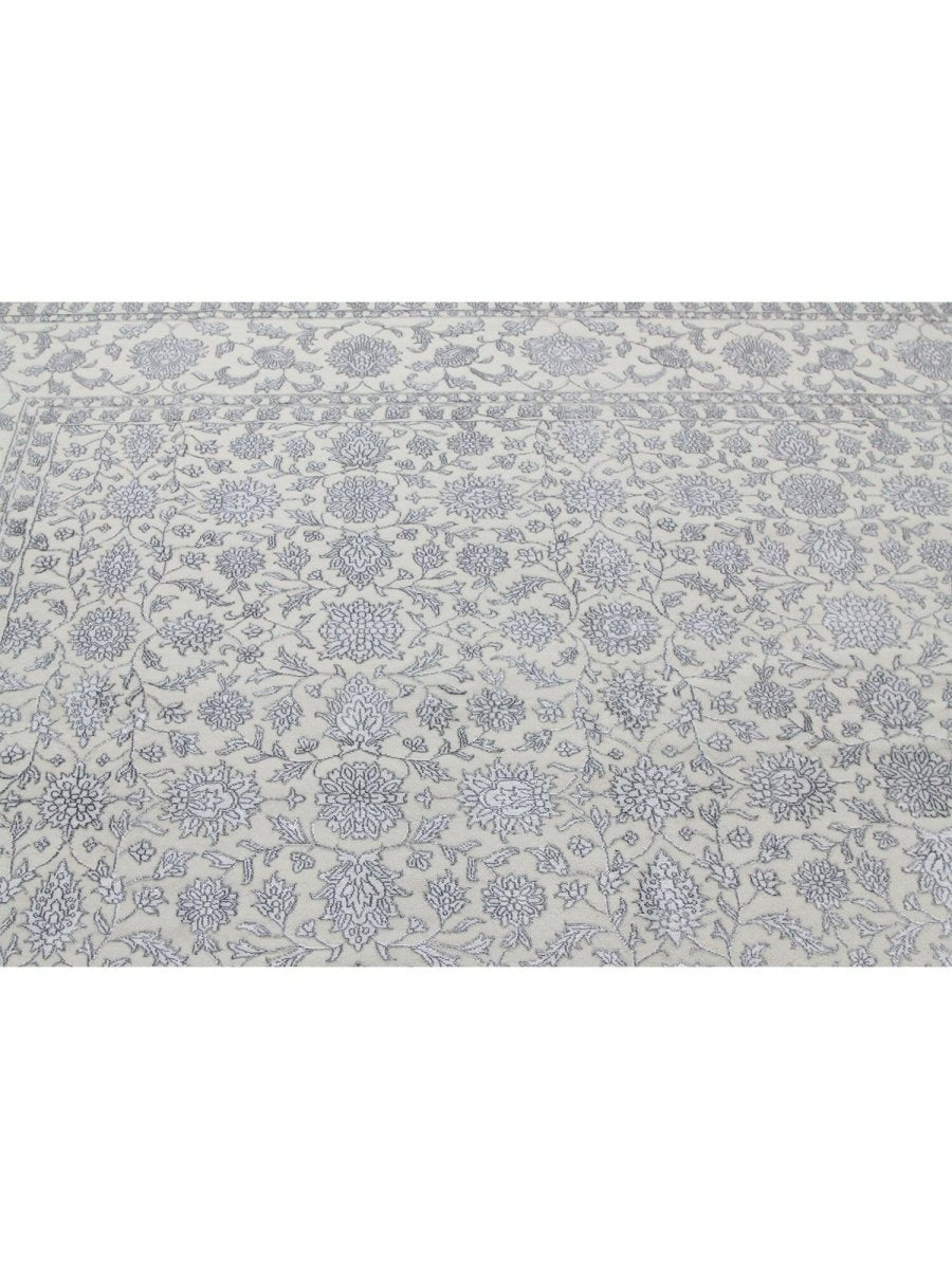 Immerse your space in the timeless elegance of this magnificent Tabriz design area rug. Expertly hand-knotted in India, this 9x12 rug is a tribute to the rich artistic heritage of Persian weaving. It is crafted from a premium blend of soft wool and lustrous bamboo silk, which gives the intricate pattern a beautiful sheen. The design features a classic all-over floral motif, rendered in a delicate and sophisticated color palette of light gray, cream, and shimmering silver tones. An elaborate border frames the central field, adding depth and a sense of formal grace. This expansive rug is perfectly scaled for anchoring large living rooms, defining a formal dining space, or bringing a serene and luxurious foundation to a primary bedroom. It is a true testament to detailed craftsmanship, destined to become a cherished heirloom.