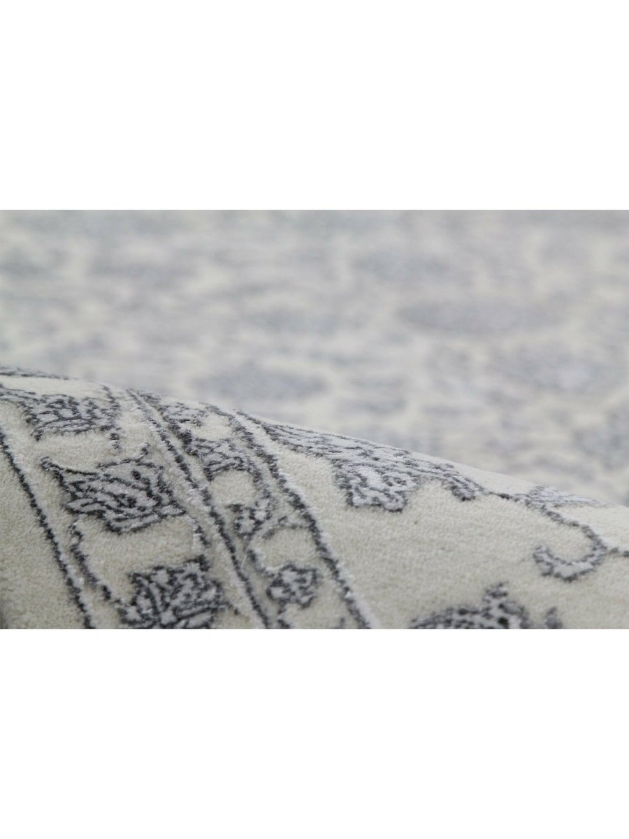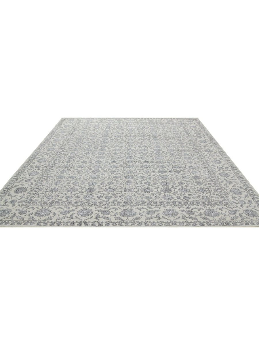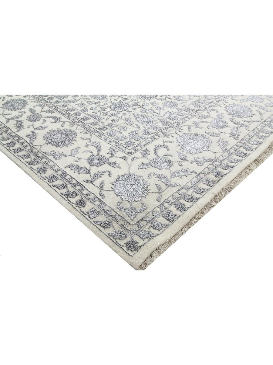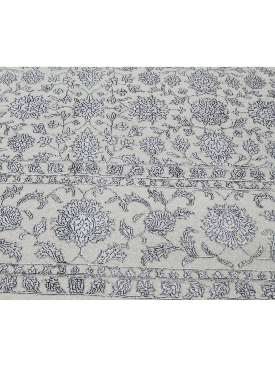 Immerse your space in the timeless elegance of this magnificent Tabriz design area rug. Expertly hand-knotted in India, this 9x12 rug is a tribute to the rich artistic heritage of Persian weaving. It is crafted from a premium blend of soft wool and lustrous bamboo silk, which gives the intricate pattern a beautiful sheen. The design features a classic all-over floral motif, rendered in a delicate and sophisticated color palette of light gray, cream, and shimmering silver tones. An elaborate border frames the central field, adding depth and a sense of formal grace. This expansive rug is perfectly scaled for anchoring large living rooms, defining a formal dining space, or bringing a serene and luxurious foundation to a primary bedroom. It is a true testament to detailed craftsmanship, destined to become a cherished heirloom.