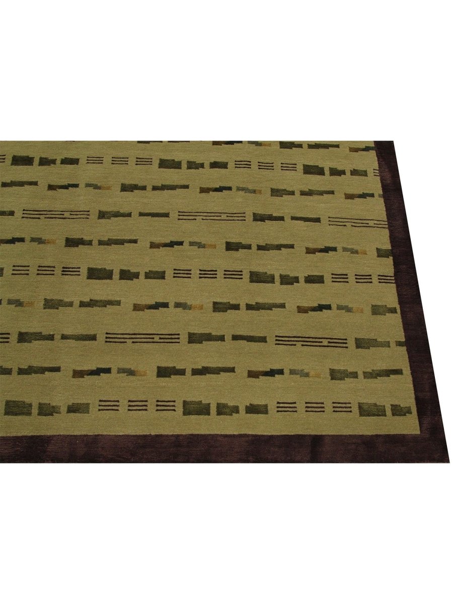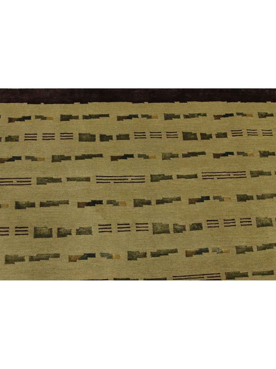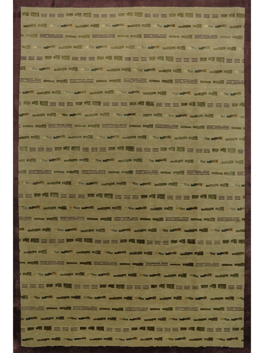 Infuse your home with a captivating sense of artistry and comforting texture with this remarkable hand-knotted 6x9 Nepali area rug, meticulously crafted in Nepal. This rug features a compelling geometric pattern, characterized by an array of horizontal bars and segmented lines in shades of olive green and subtle brown, set against a light beige field. The arrangement creates a rhythmic and dynamic visual effect that is both structured and visually intriguing. The overall design offers a textured surface that adds depth and understated character to any room.