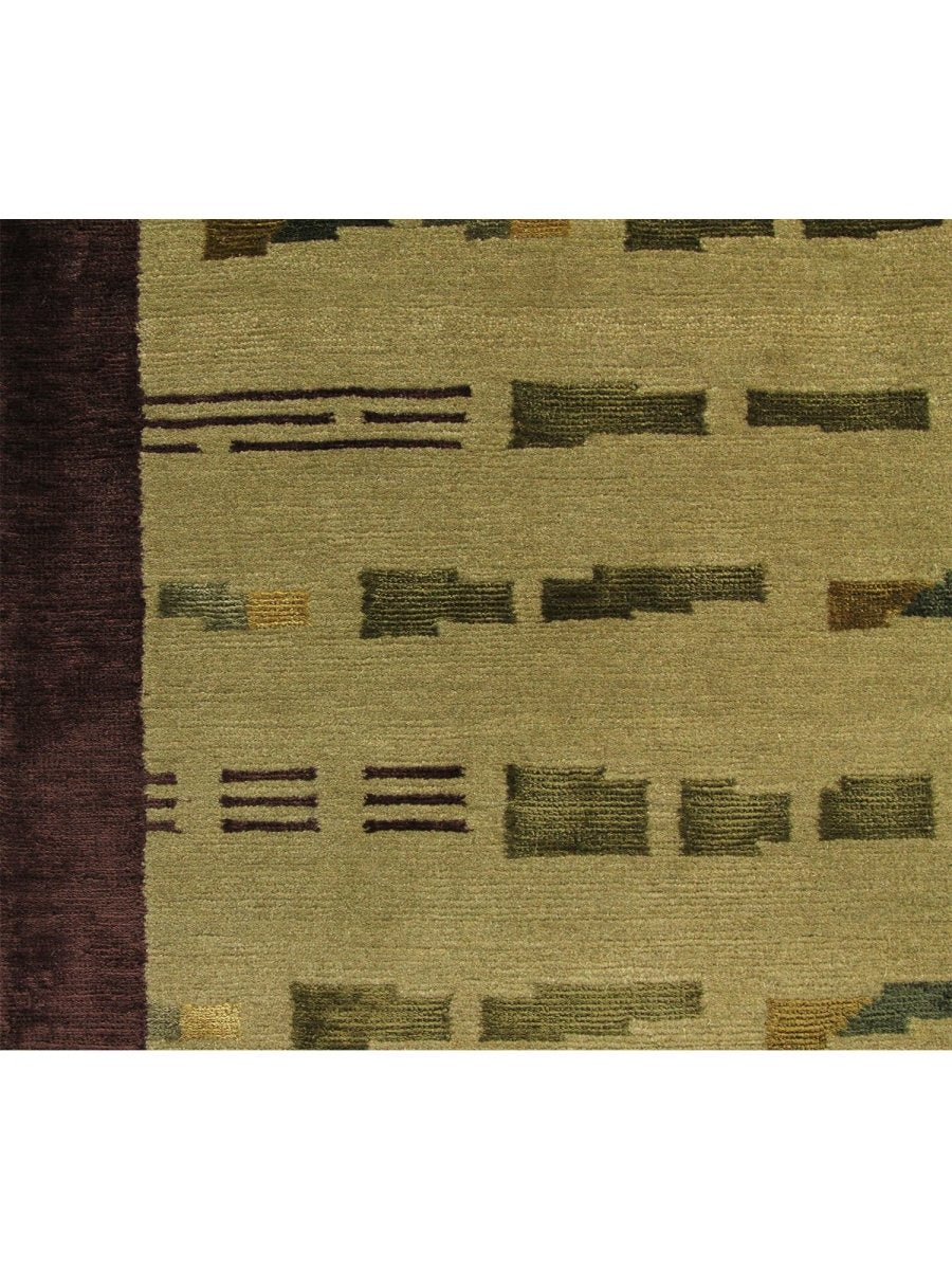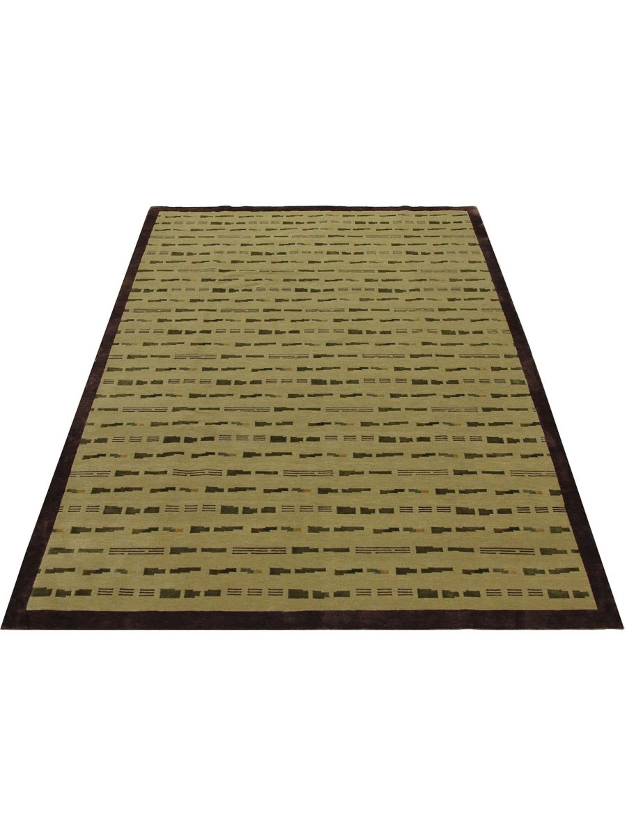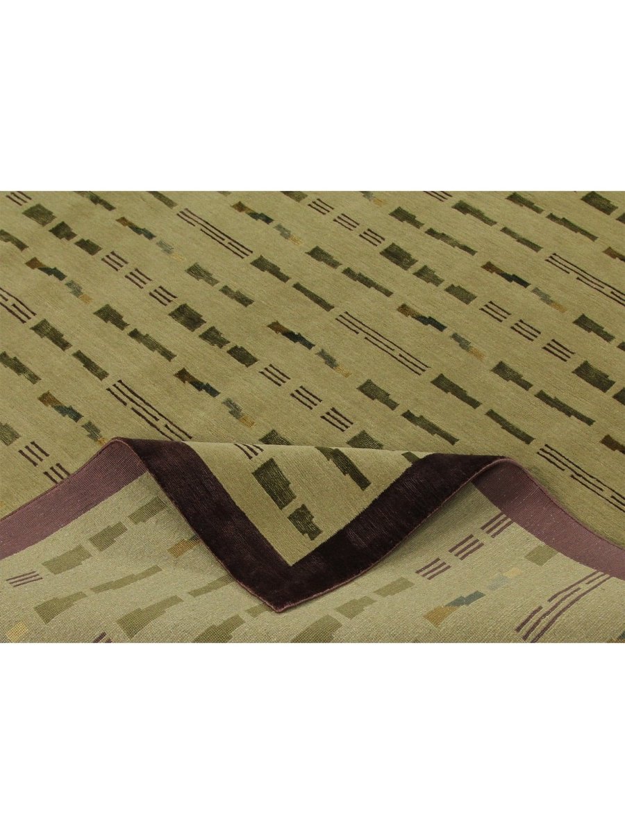 Infuse your home with a captivating sense of artistry and comforting texture with this remarkable hand-knotted 6x9 Nepali area rug, meticulously crafted in Nepal. This rug features a compelling geometric pattern, characterized by an array of horizontal bars and segmented lines in shades of olive green and subtle brown, set against a light beige field. The arrangement creates a rhythmic and dynamic visual effect that is both structured and visually intriguing. The overall design offers a textured surface that adds depth and understated character to any room.