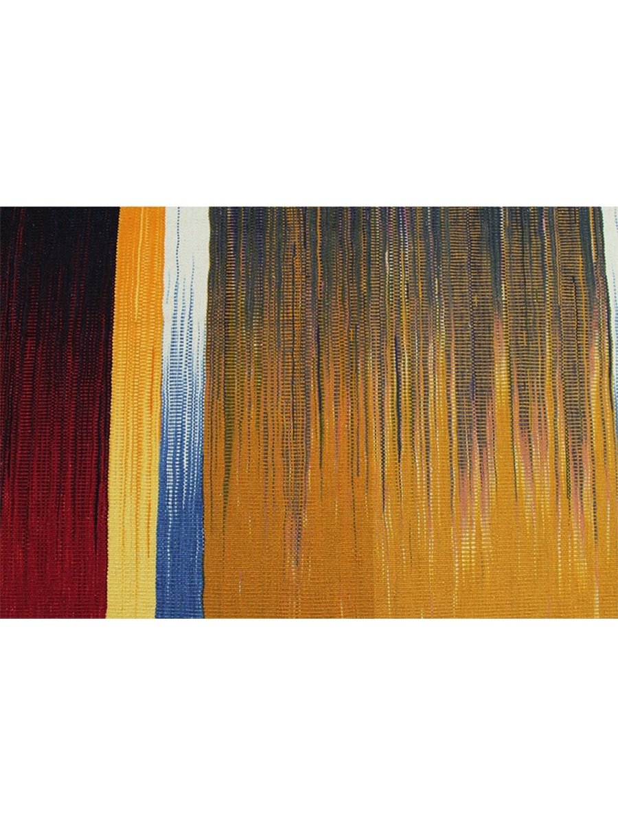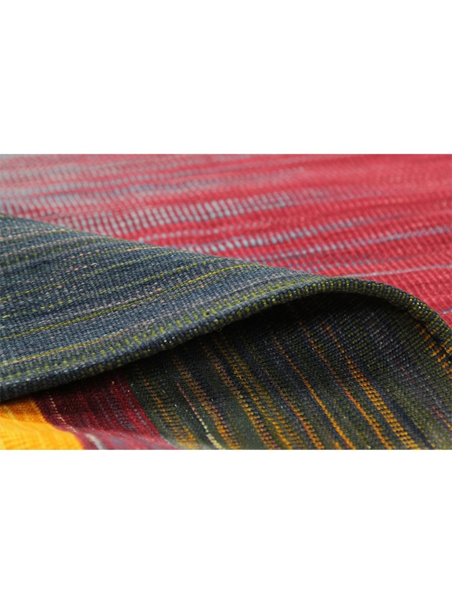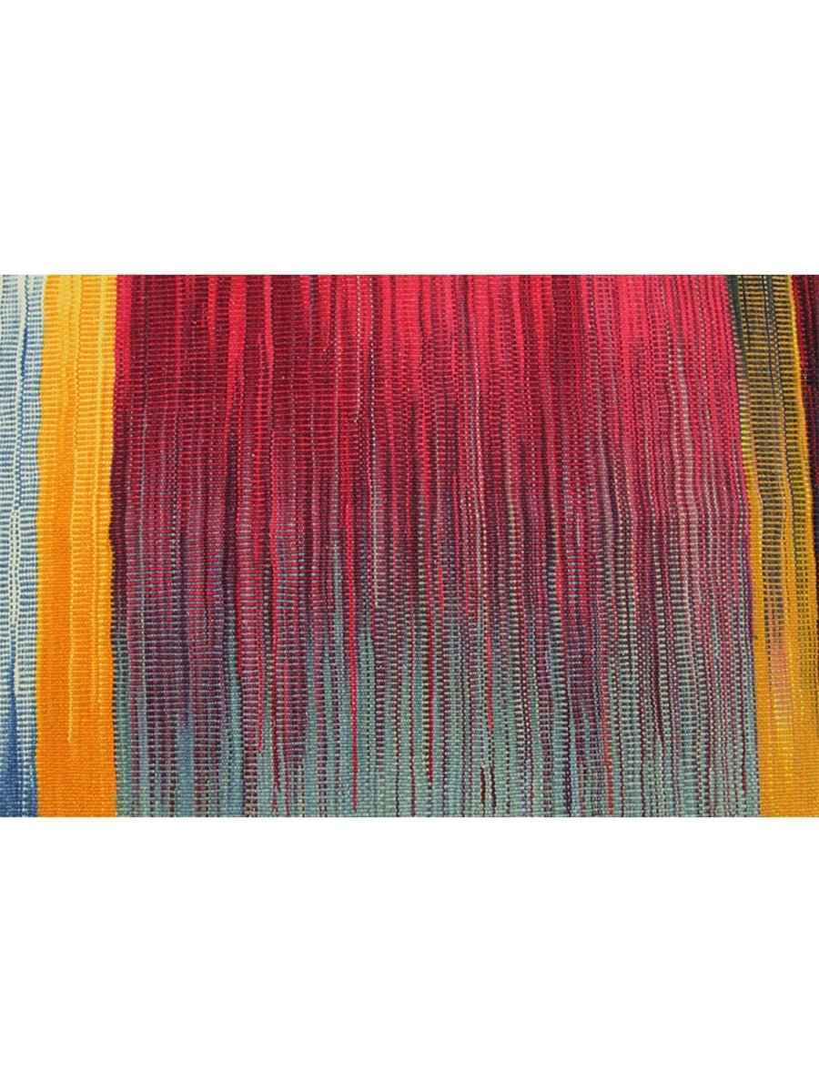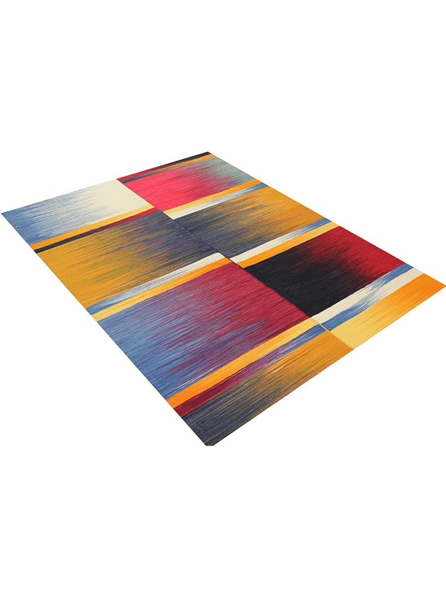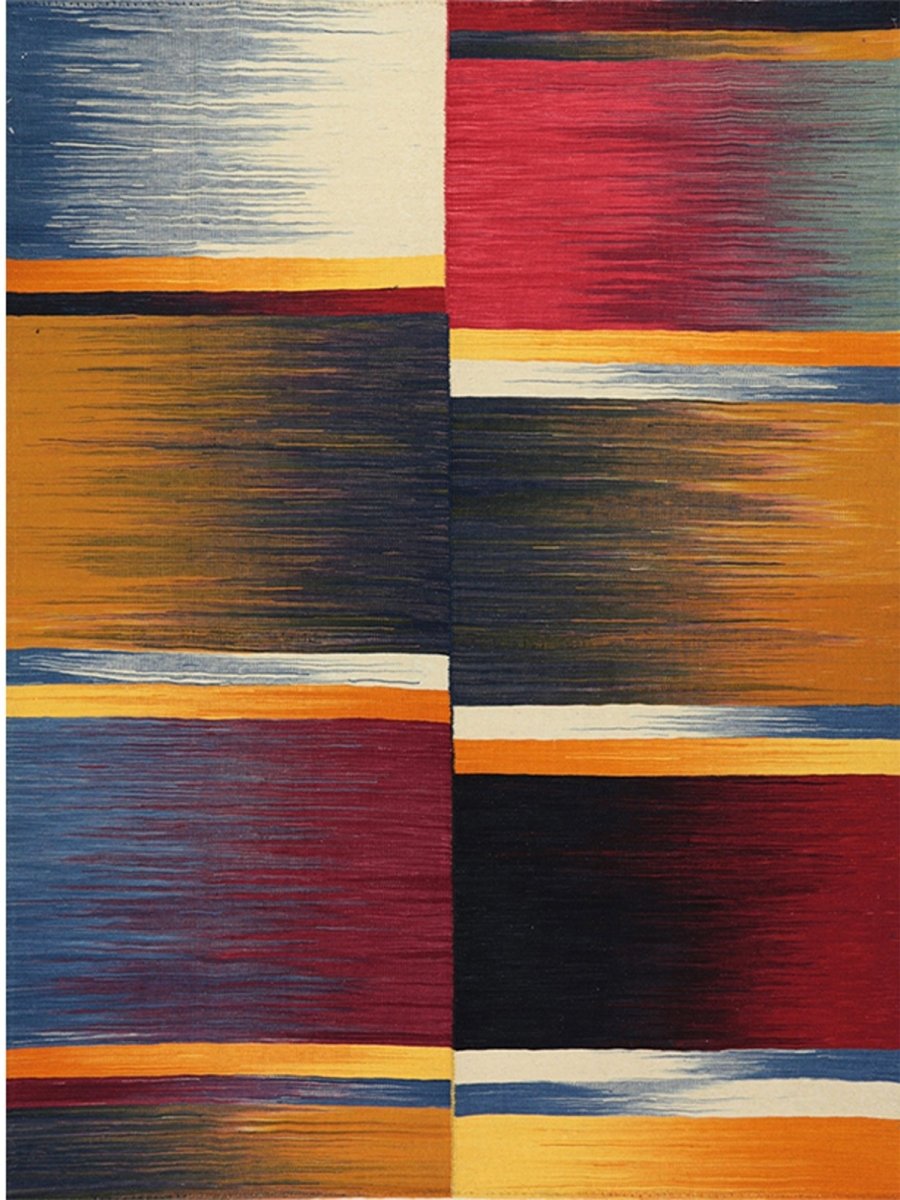 The combination of structured geometric forms and soft gradients adds depth and movement, making this rug a captivating statement piece. Its flatweave construction ensures durability and easy maintenance. This rug enhances any setting with its bold and expressive design.