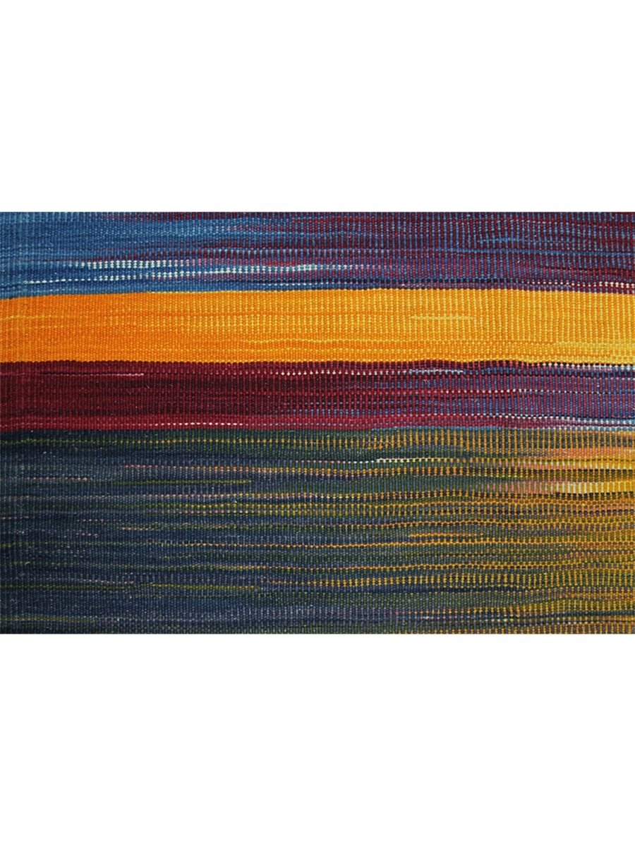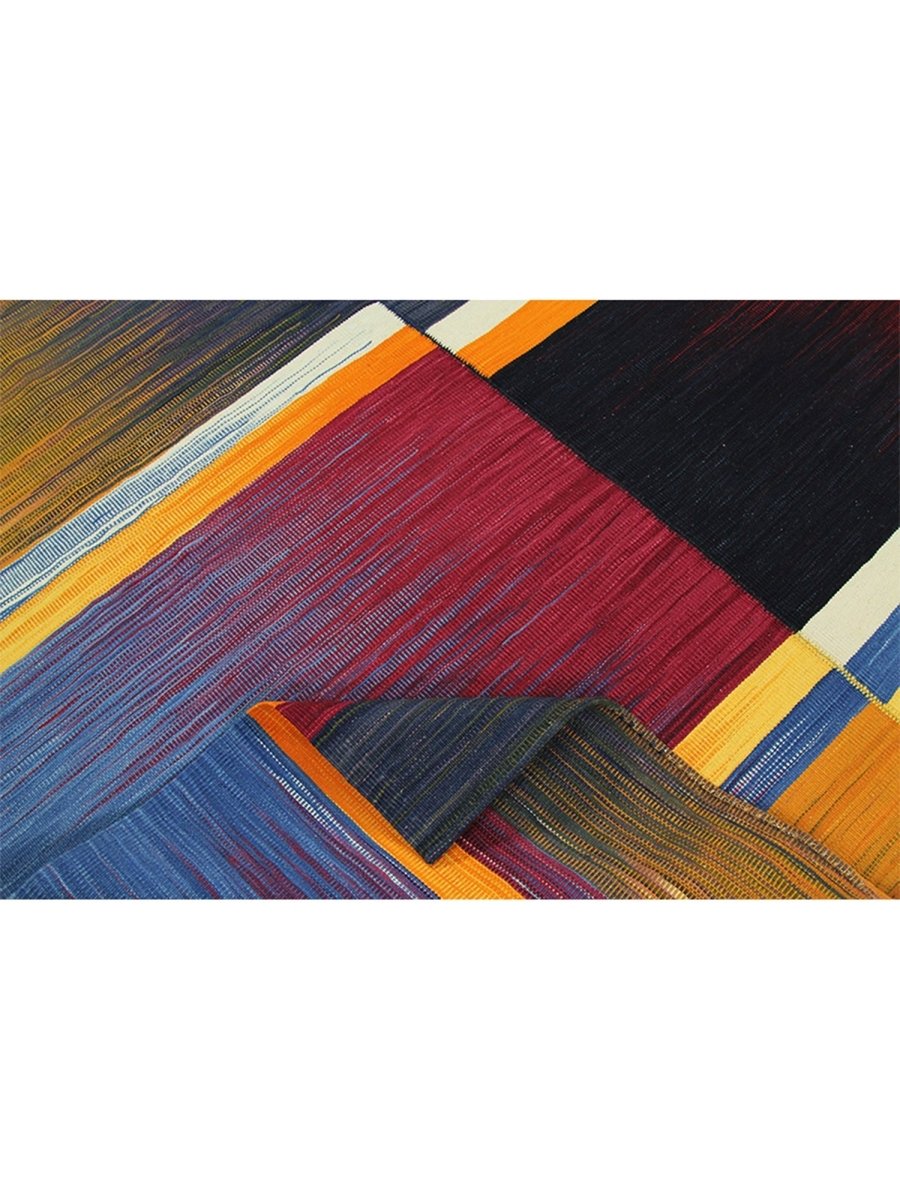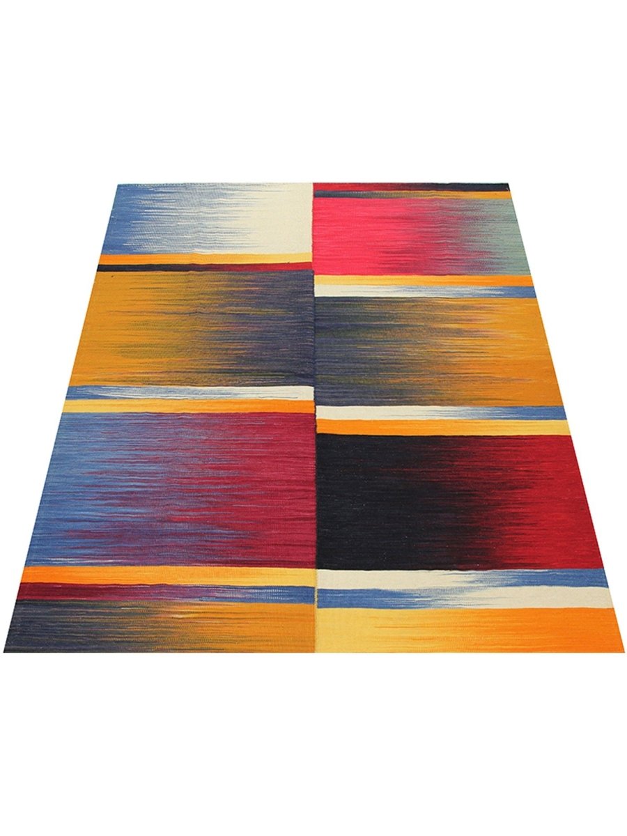 This 5x6 Persian Kilim Area Rug showcases a striped pattern, handwoven in Persia from high-quality wool. Featuring bold rectangular color blocks with gradient striping, it blends navy blue, black, burgundy, orange, red, mustard, and cream tones for a dynamic look.