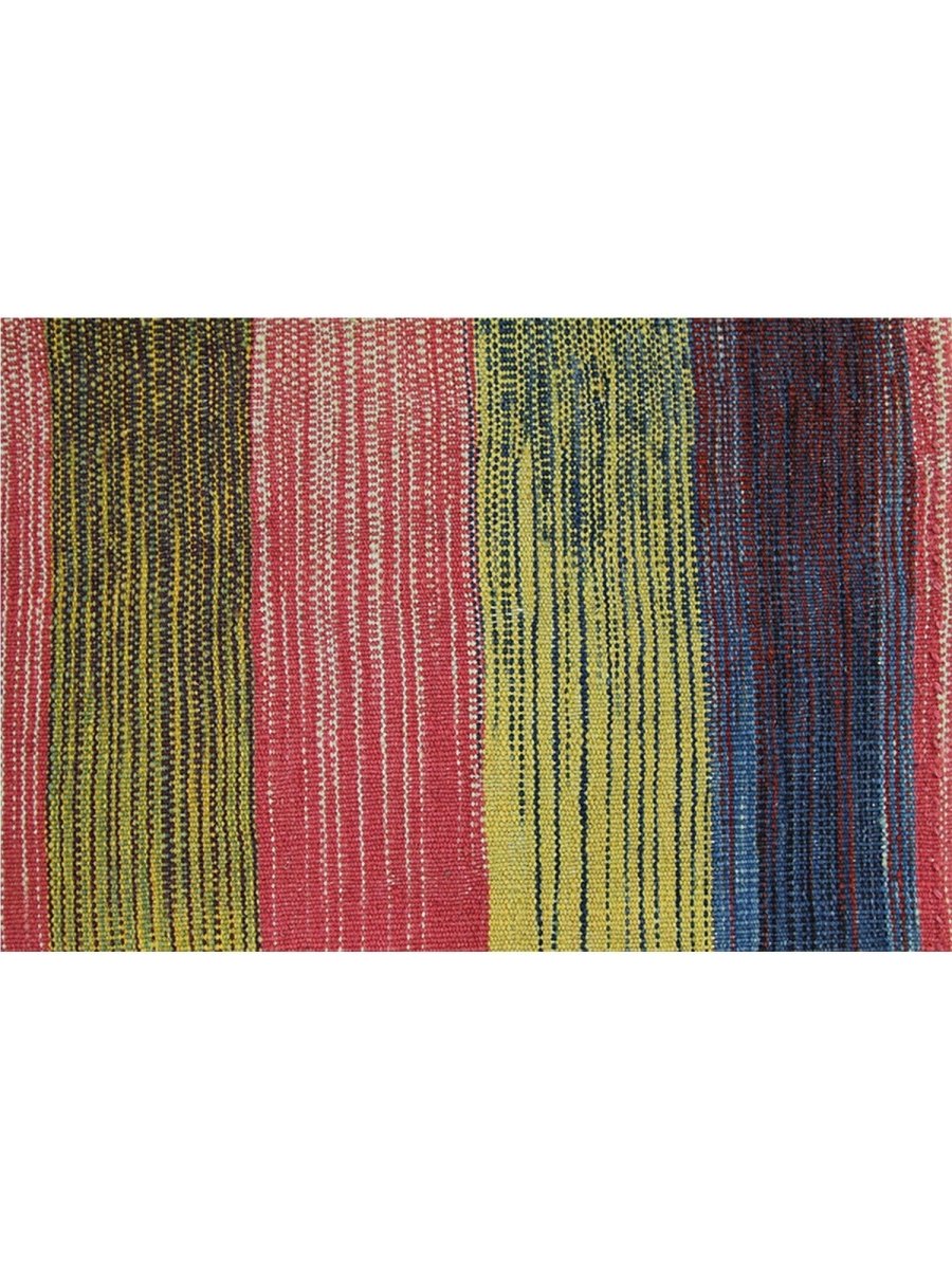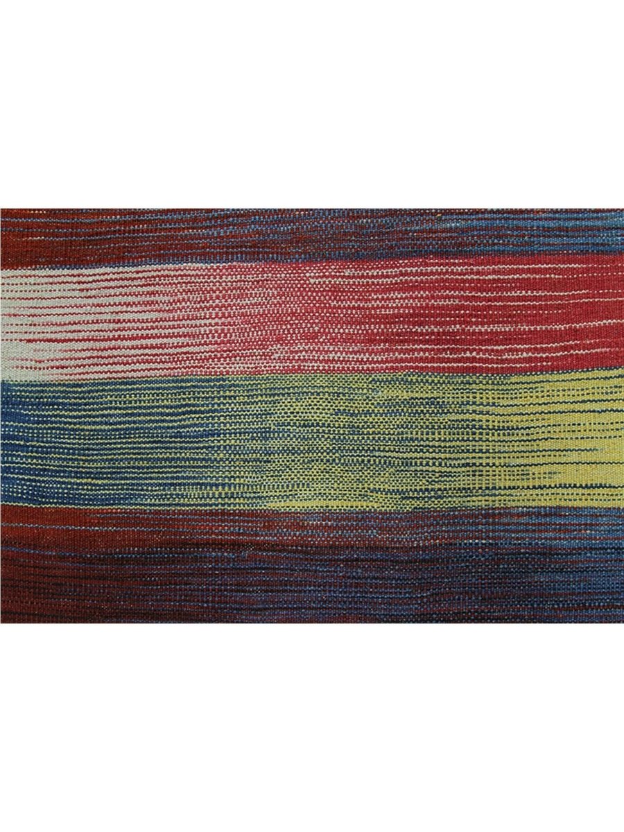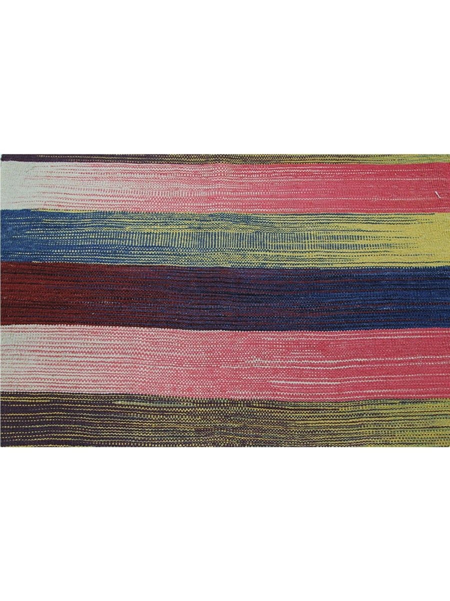 This 5x6 Persian Kilim Area Rug offers a lively design with bold horizontal stripes in red, yellow, blue, and deep purple, contrasting against a neutral cream base. The stripes feature smooth shifts, while others showcase a textured, layered effect. This rhythmic flow of colors creates a sense of movement, adding visual energy to the piece. Ideal for eclectic, bohemian, or chic spaces, this rug brings warmth and personality to any room. Its striking pattern and vibrant hues make it a perfect fit for creative spaces or as a statement piece in your home. Experience the perfect combination of beauty, durability, and artistry.