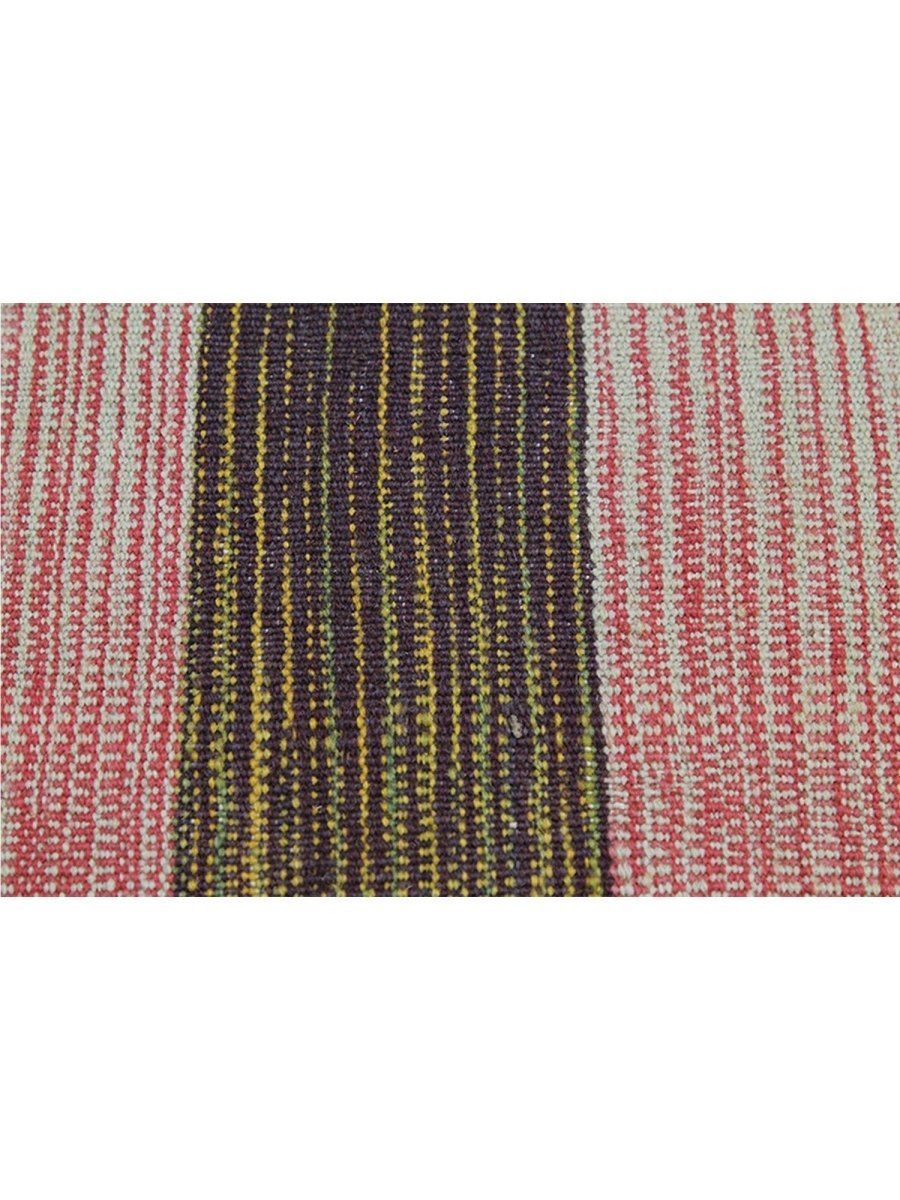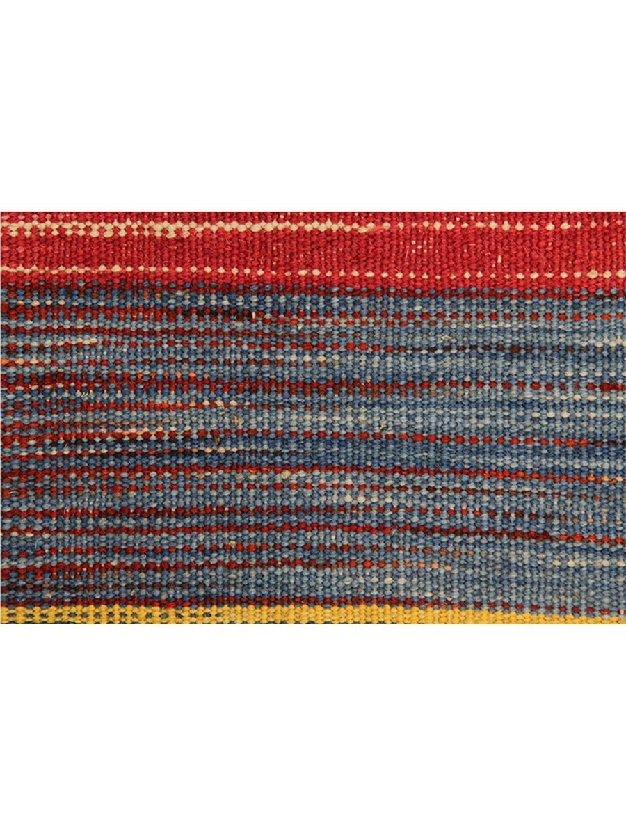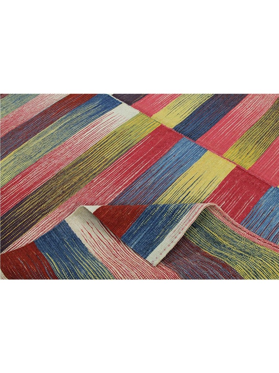This 5x6 Persian Kilim Area Rug offers a lively design with bold horizontal stripes in red, yellow, blue, and deep purple, contrasting against a neutral cream base. The stripes feature smooth shifts, while others showcase a textured, layered effect. This rhythmic flow of colors creates a sense of movement, adding visual energy to the piece. Ideal for eclectic, bohemian, or chic spaces, this rug brings warmth and personality to any room. Its striking pattern and vibrant hues make it a perfect fit for creative spaces or as a statement piece in your home. Experience the perfect combination of beauty, durability, and artistry.