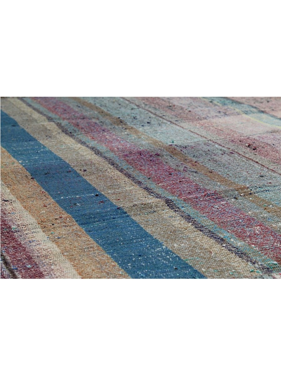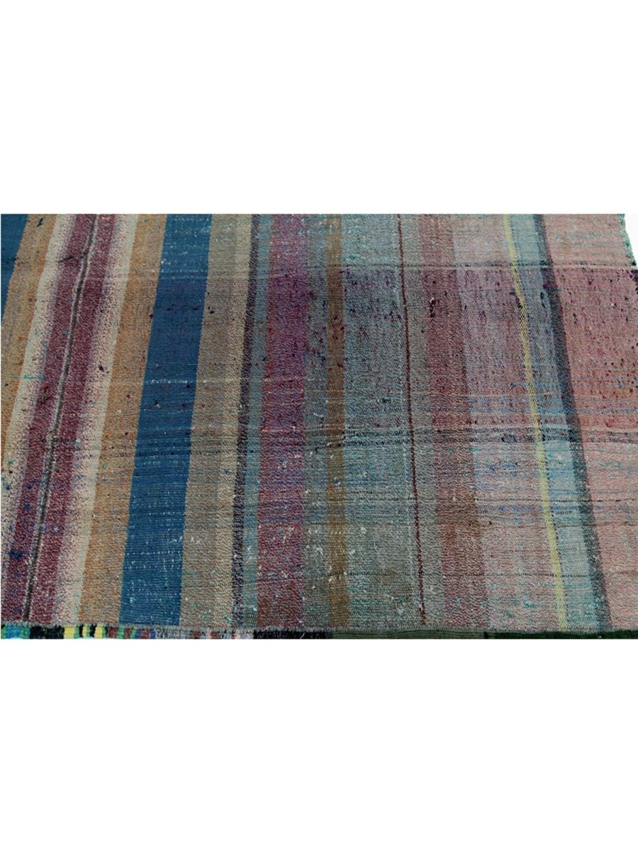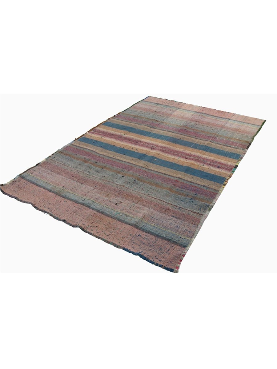 The 5x8 Persian Kilim Area Rug showcases a soothing design with wide horizontal stripes in soft pastel shades. Gentle pinks, muted blues, and warm earth tones blend together harmoniously in a subtle gradient effect. The texture of the rug enhances the overall composition, giving it depth and richness. The faded quality of the colors evokes a sense of tranquility and calm, making it perfect for spaces that require a serene vibe. This rug is ideal for sleek or minimalist interiors, adding understated elegance. This rug brings a blend of cultural artistry and chic charm to your interior. This rug is a timeless accent that will enrich your living space.