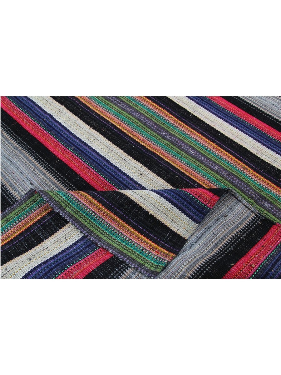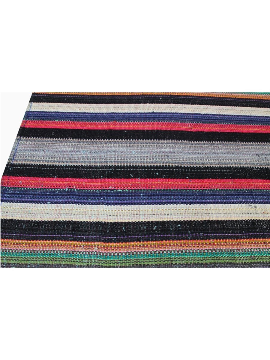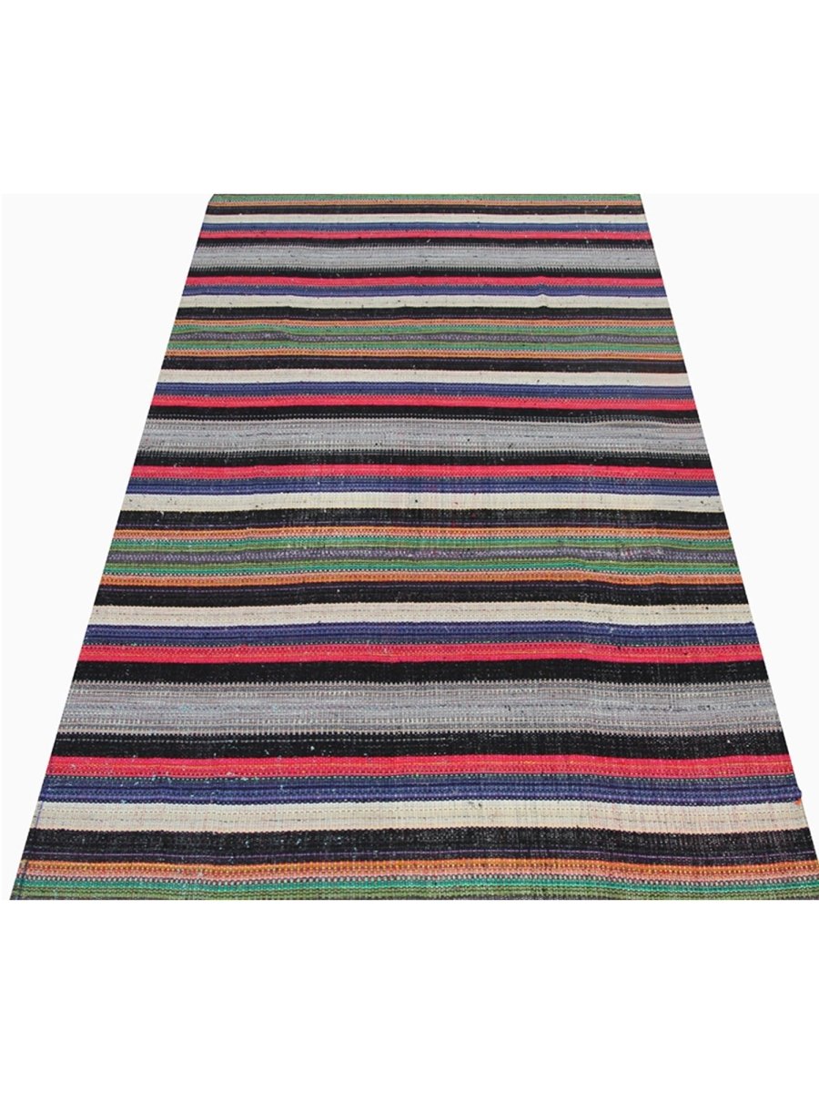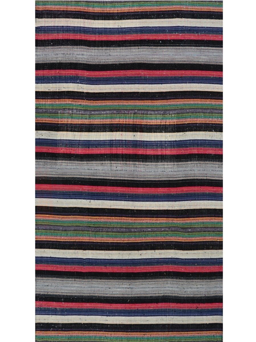 The 5x9 Persian Kilim Area Rug features a lively and rhythmic striped design. With a color palette of red, blue, green, black, and orange balanced by neutral shades of gray and cream, the rug brings dynamic energy to any room. The varying thicknesses of the stripes add texture, creating a visually engaging piece. Intricate woven details within each stripe contribute depth, making the rug perfect for eclectic or chic spaces. This rug brings a blend of cultural artistry and chic charm to your interior.