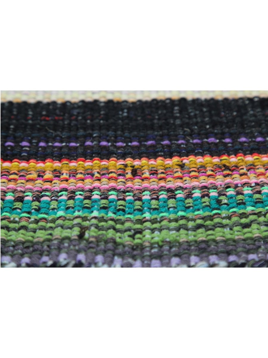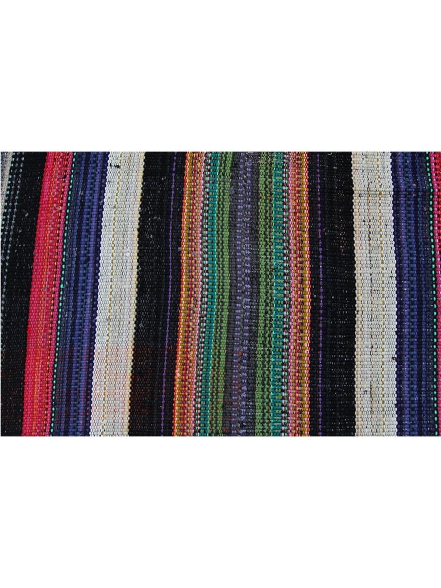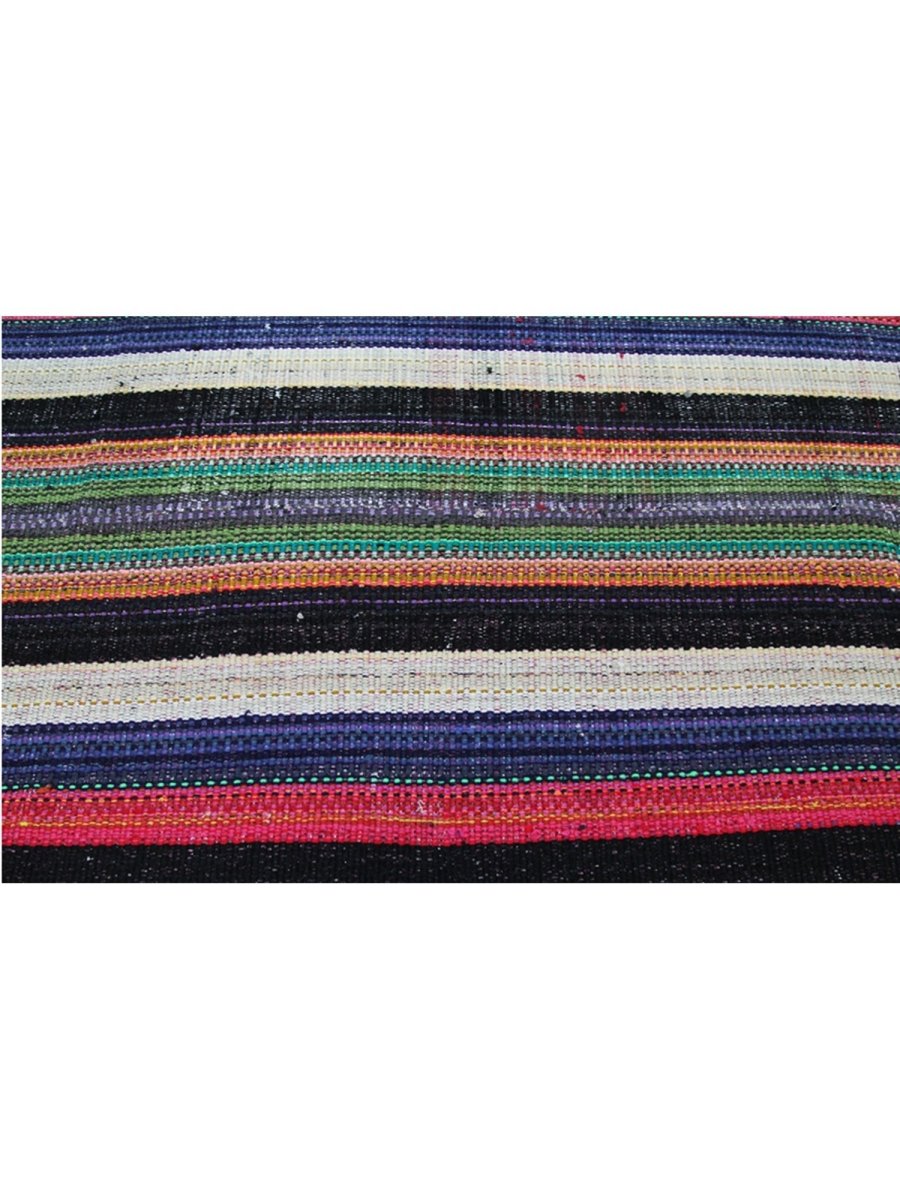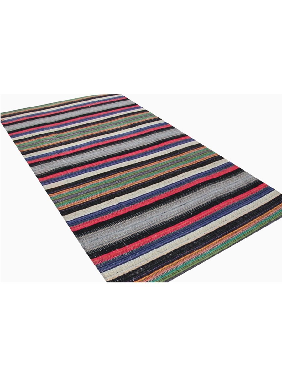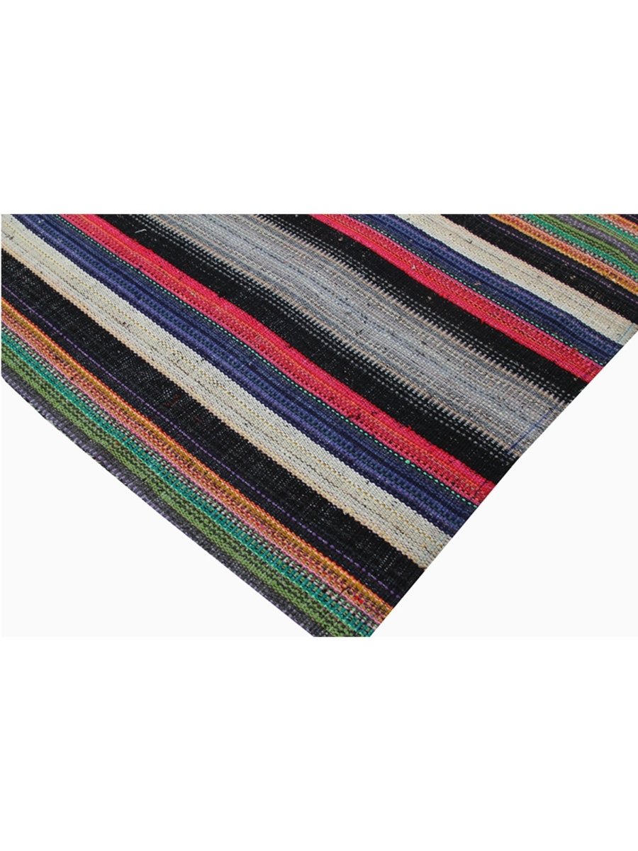 The 5x9 Persian Kilim Area Rug features a lively and rhythmic striped design. With a color palette of red, blue, green, black, and orange balanced by neutral shades of gray and cream, the rug brings dynamic energy to any room. The varying thicknesses of the stripes add texture, creating a visually engaging piece. Intricate woven details within each stripe contribute depth, making the rug perfect for eclectic or chic spaces. This rug brings a blend of cultural artistry and chic charm to your interior.